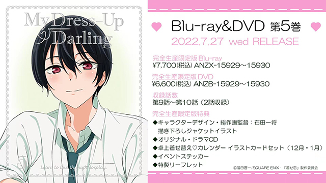 电视动画「更衣人偶坠入爱河」公开了Blu-ray&DVD第五卷封面使用插图。该系列商品共6卷,第五卷收录了动画第9、10话的内容,Blu-ray售价为7700日元(含税),DVD售价为6600日元(含税),将于2022年7月27日正式发售。