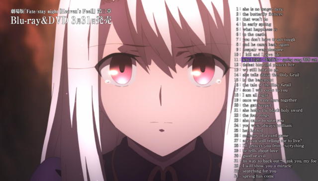 「命运之夜——天之杯3:春之歌」OST试听公开 次元速报 资讯 21年3月1日 编辑 瑜瑰 取消关注 关注 私信 由Type Moon同名文字冒险类游戏改编,飞碟社制作的剧场版动画「命运之夜——天之杯3:春之歌」于近期公开了OST的试听片段。OST将于2021年3月31日发售。